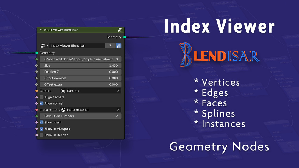 This Node Group lets you view the indices of the vertices, edges, faces of a mesh, indices of a splines group and instances distribute or in a collection. This Node Group works with Blender 3.1+ and above.