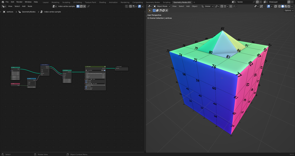 Este grupo de nodos le permite ver los índices de los vértices, las aristas, las caras de una malla, los índices de un grupo de splines y las instancias distribuidas o en una colección. Este grupo de nodos funciona con Blender 3.1+ y superior.