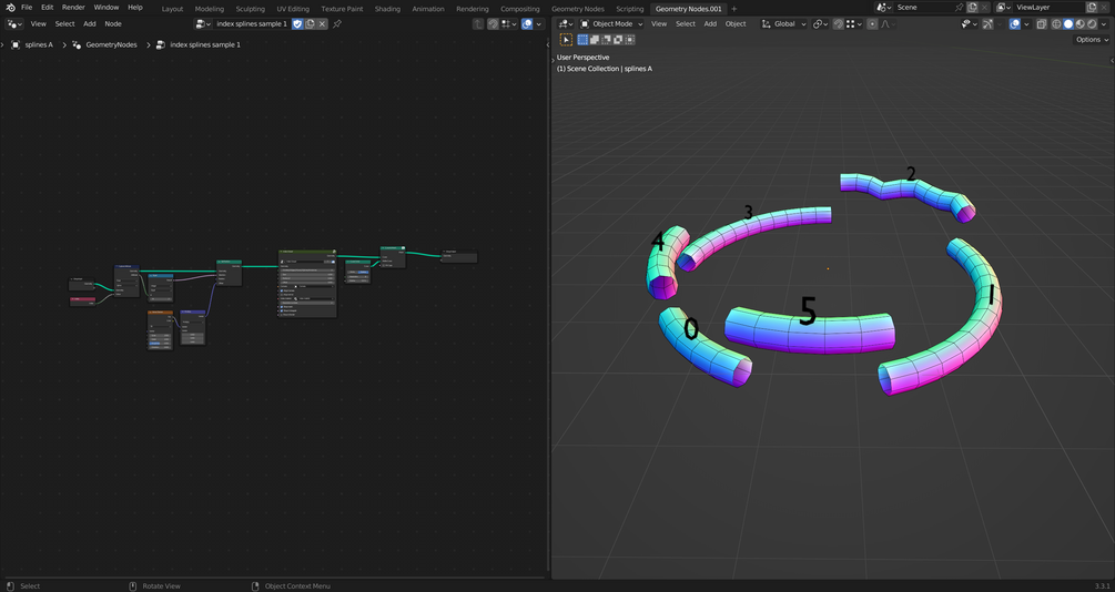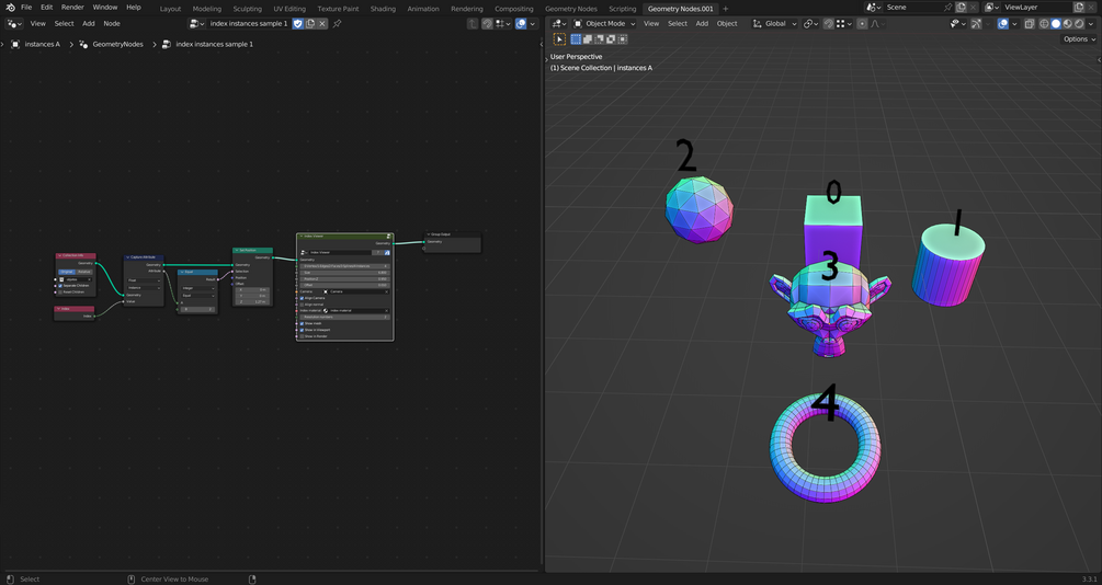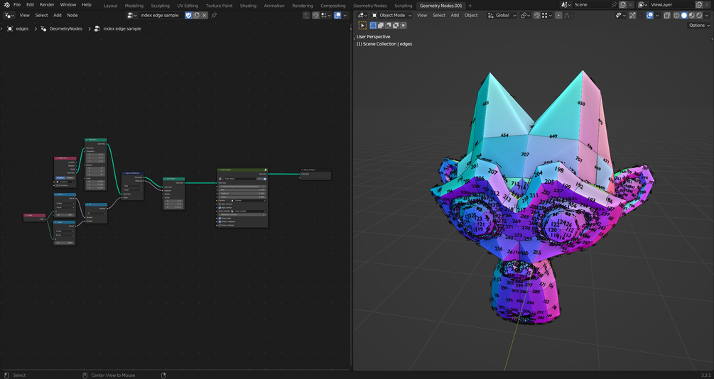 Este grupo de nodos le permite ver los índices de los vértices, las aristas, las caras de una malla, los índices de un grupo de splines y las instancias distribuidas o en una colección. Este grupo de nodos funciona con Blender 3.1+ y superior.